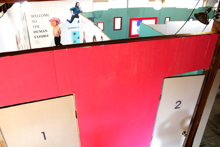 If you choose two, you enter into what appears to be an apartment- complete with music playing, and calming blue carpeting and walls. You walk inside, take a seat in the cozy chair, gaze upon the landscape painting on the wall. Suddenly, you feel eyes on you. You look up to see faces peering through hung picture frames-watching you. You notice the TV is not a TV at all, but another viewing window with faces watching you. A bowl of candy is there for you to take a treat. Relax, and welcome to the Human Habitat.